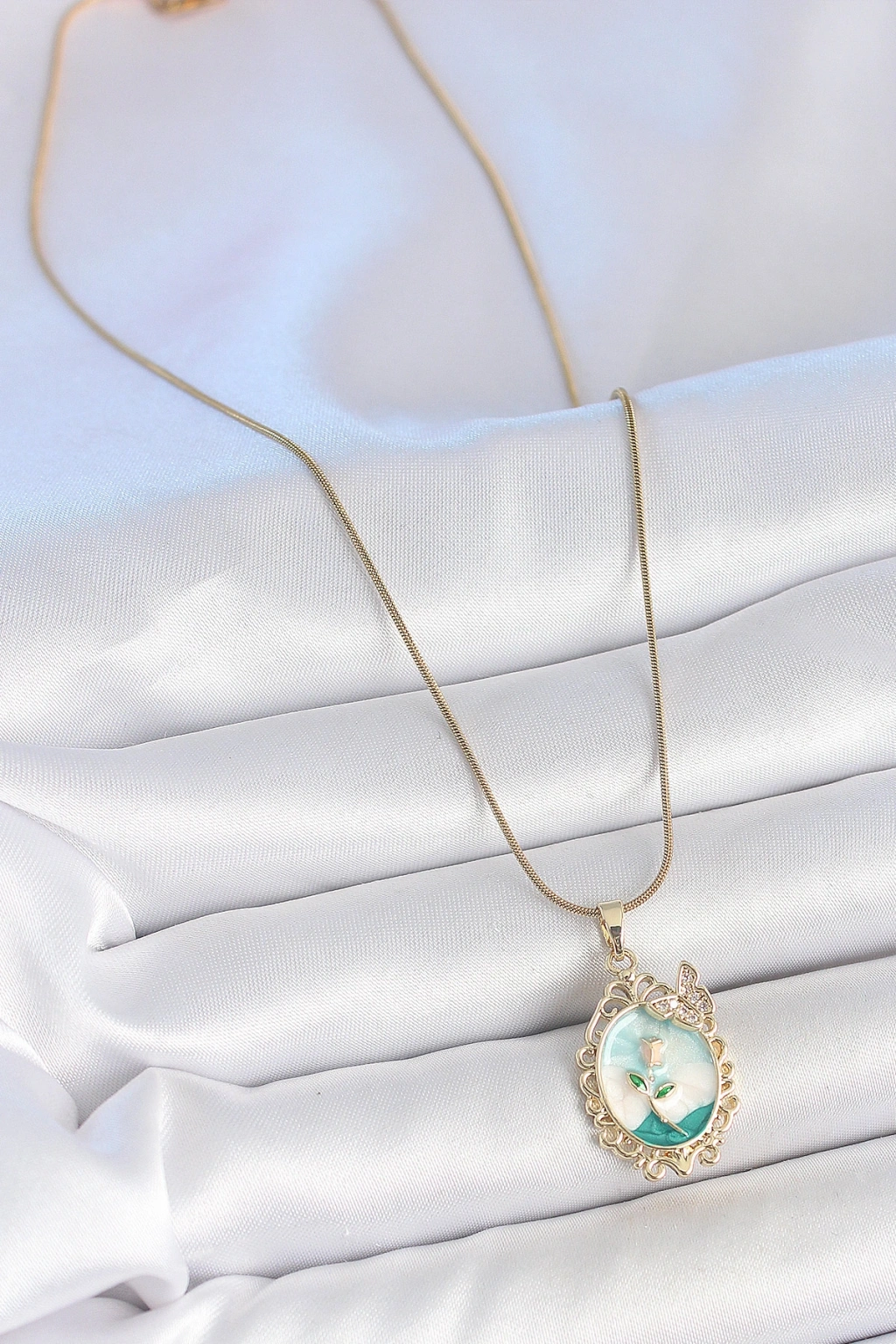 316L Çelik Gold Renk Zincir Mavi Mineli Çiçek İşlemeli Zirkon Taş Detaylı Portre Model Kadın Kolye - TJ-BKO10183