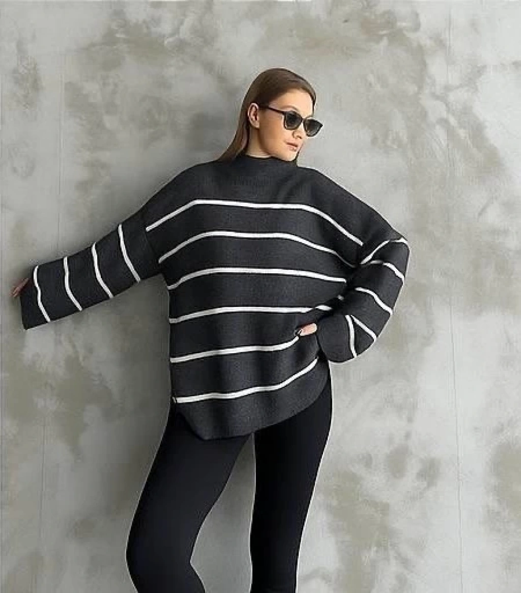 Çizgili ispanyol kol triko boğazlı kazak antrasit elf