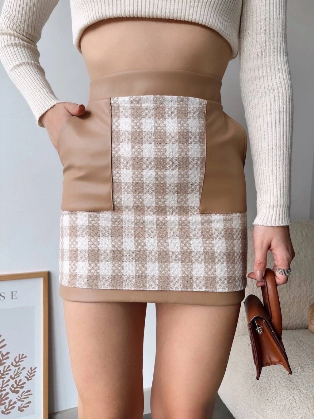 • Deri cep garnili kaşe etek bej h24604