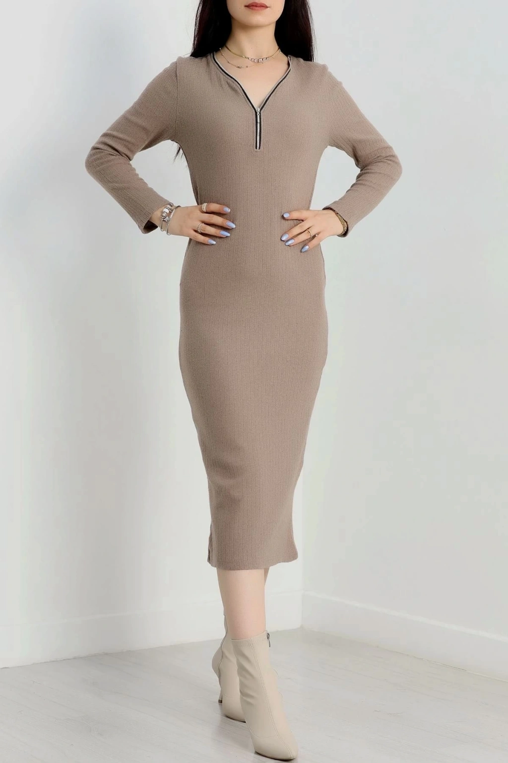 Fermuar detaylı fitilli şardonlu elbise bej a3178
