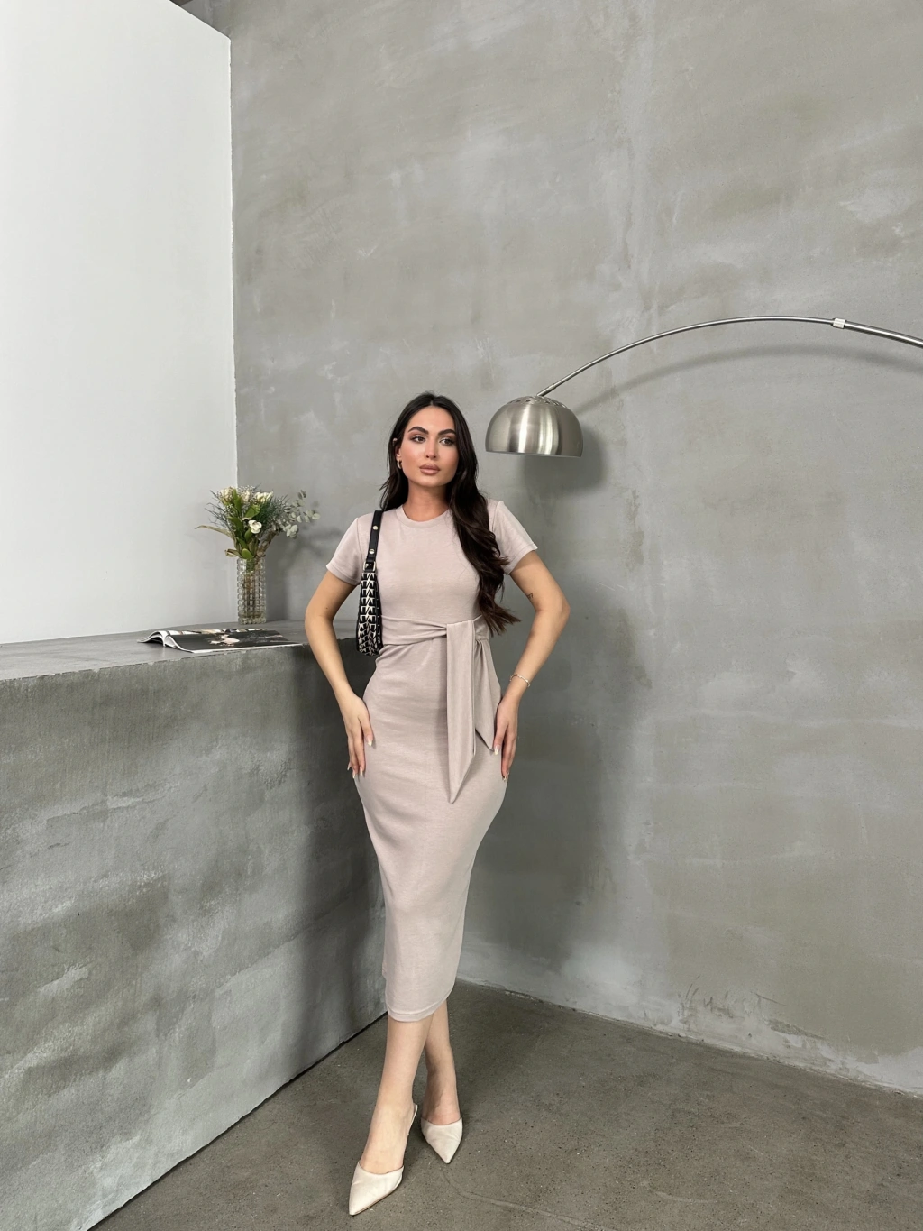 Bu bej renkli Kuşaklı Model Esnek Kumaşlı Elbise, şıklığı ve rahatlığı bir arada sunuyor.