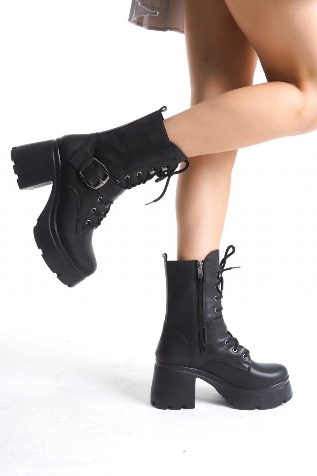• Linma Siyah Cilt Bağcıklı Topuklu Bot