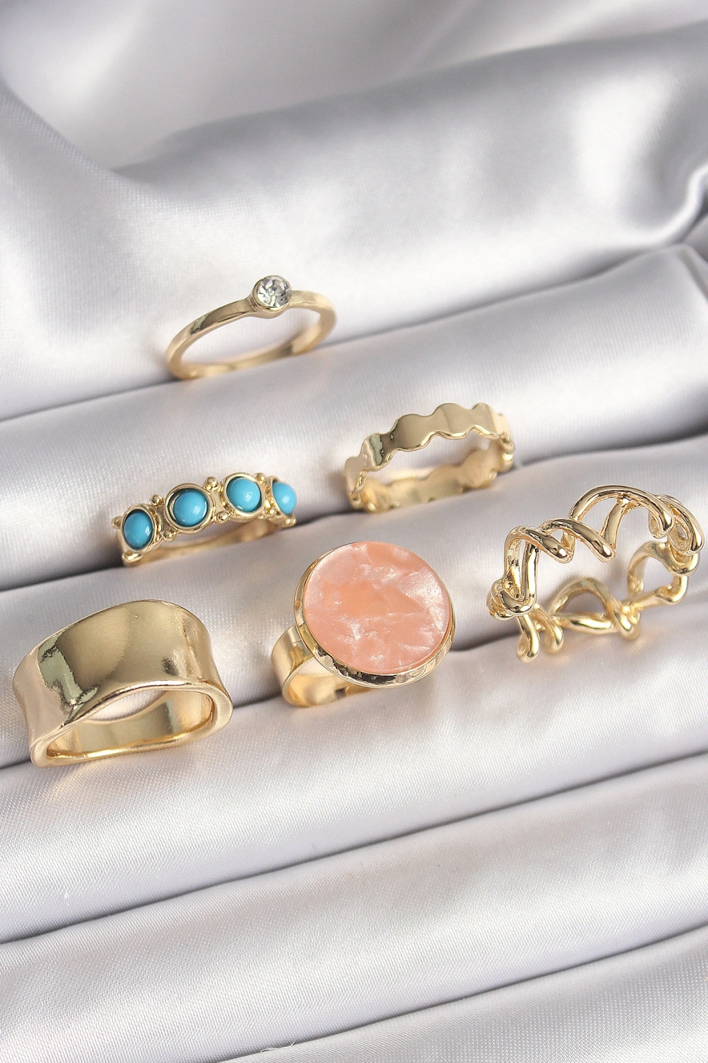 Pirinç Gold Renk Daire Pembe Mineli Zirkon Taş Detaylı 6'Lı Kadın Yüzük Seti - TJ-BYK3610
