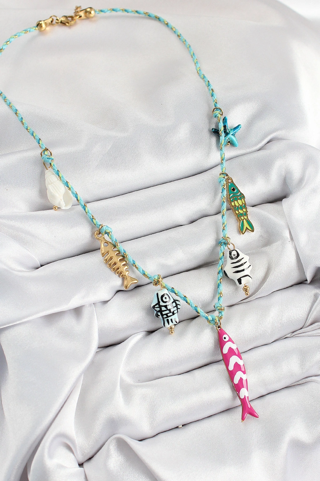 Seramik Motifli Pembe Balık Figürlü Model Mavi İp Kadın Kolye - TJ-BKO10397