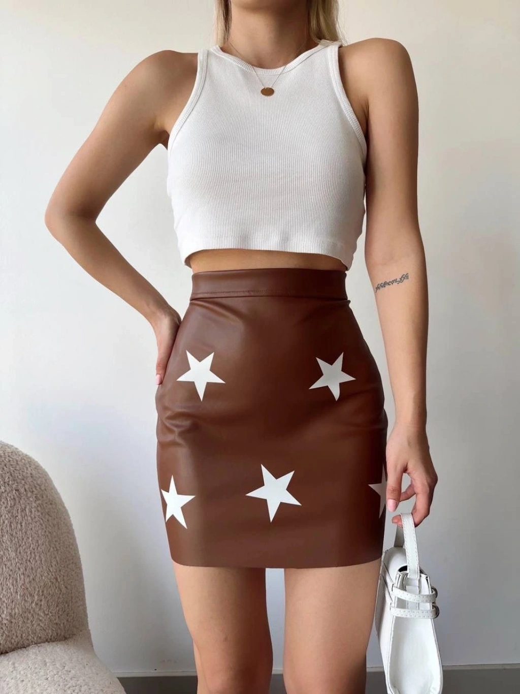 Bu şık ve trend yıldız baskılı deri etek, gardırobunuza yıldızı bir parça ekleyecek! Modern ve şık tasarımıyla her kombini mükemmel bir şekilde tamamlayacak.